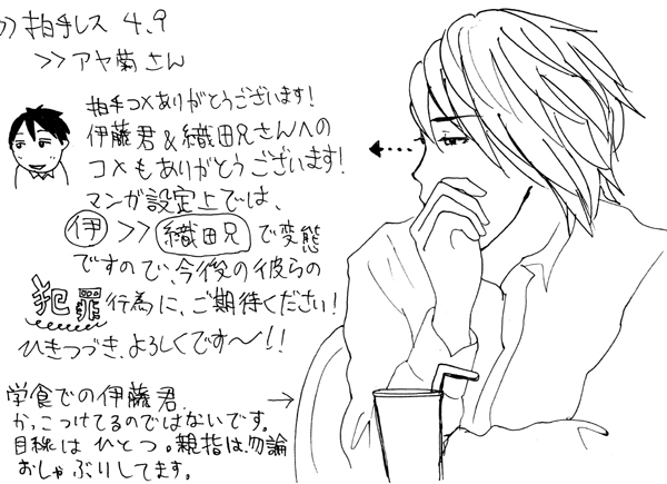 と言う事で、先ほど帰ってきまして、新幹線の中で描いた拍手レスです↓